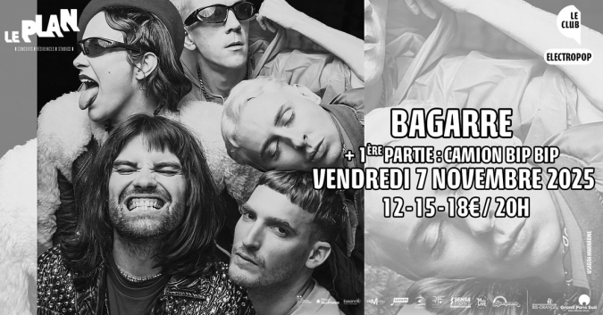 BAGARRE + Camion BIP BIP, en concert le vendredi 7 novembre 2025 au PLAN à Ris Orangis. Cette année 2025 sera la dernière pour Bagarre qui met fin à 10 ans de carrière sur un dernier EP : « Nous étions cinq », et une tournée d’adieu. LE PLAN les reçoit au Club dans un concert chargé d'émtions et de fièvre avec Camion Bip Bip pour ouvrir les festivités.
