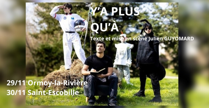 Y'À PLUS QU'À... Ou que faire lorsque tout est trop grand pour nous. Focus sur la création de la Compagnie Scena nostra : Y’a plus qu’à... jouée le samedi 29 novembre à Ormoy-la-Rivière et le dimanche 30 novembre à Saint-Escobille. Si on veut écrire une pièce de théâtre positive, on ne choisit pas l’écologie. On ne choisit pas l’avenir de l’humanité.