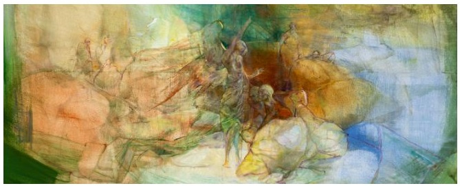 Le peintre a 60 ans et sa peinture connait une inflexion teintée d’un certain orientalisme. La lumière de Calcutta où il retrouve son ami le père François Laborde (1927-2020), lors de fréquents séjours en Inde, s’invite dans sa peinture et avec elle une forme de félicité retrouvée comme en témoigne son tableau Le Gange à Hardwar.