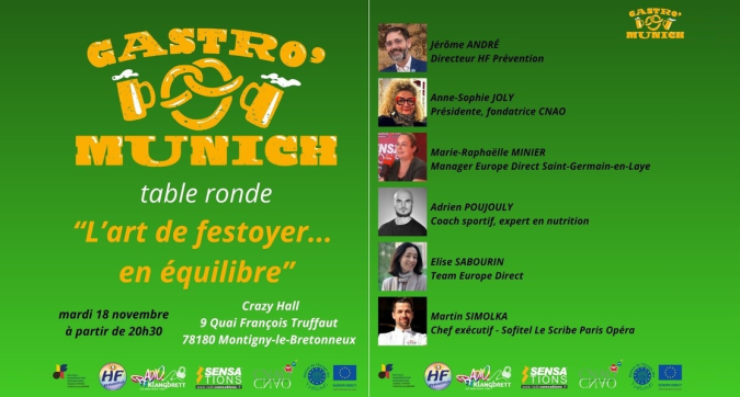 Table ronde « L’art de festoyer… en équilibre » Mardi 18 novembre 2025 à 20h30 au Crazy Hall à Montigny-le-Bretonneux. Comment concilier plaisir culinaire et bien-être lors des grands moments festifs ? C’est le fil rouge de la table ronde « L’art de festoyer… en équilibre », organisée le mardi 18 novembre 2026 au Crazy Hall, à Montigny-le-Bretonneux, avec le soutien du Fonds citoyen franco-allemand et portée par HF Prévention.