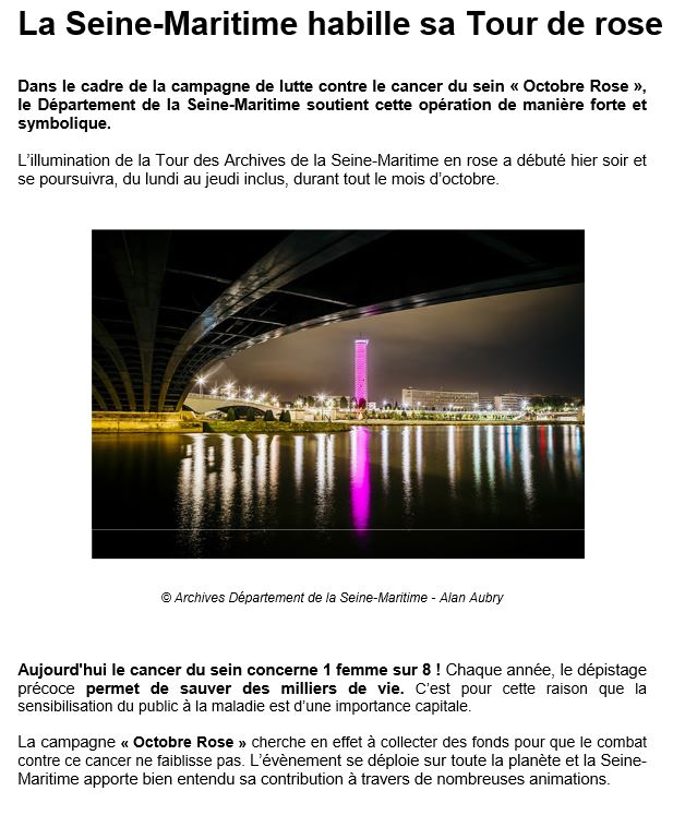 Dans le cadre de la campagne de lutte contre le cancer du sein « Octobre Rose », le Département de la Seine-Maritime soutient cette opération de manière forte et symbolique.