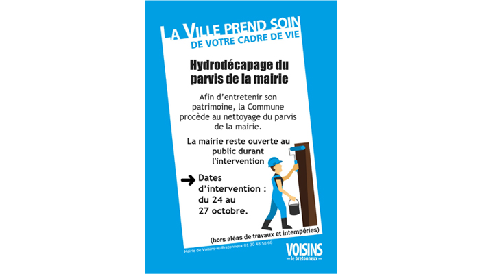 Afin d'entretenir son patrimoine, la Commune procède au nettoyage du parvis de la mairie du 24 au 27 octobre. Cette dernière reste ouverte pendant l'intervention.