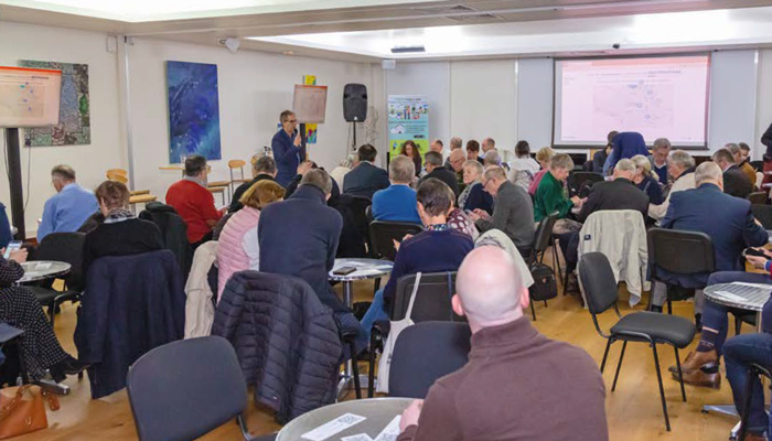 « Une expérience collective unique, onirique et futuriste » commente Pascal Dubois, président de Sens Civique, face aux 74 personnes présentes ce mercredi soir en salle du conseil. Après avoir invité les participants à flasher un QR Code pour participer à l’expérience en indiquant leur quartier sur les trois écrans interactifs, il a ensuite rappelé les enjeux du projet, avant de diffuser le fameux récit : un film, dont chaque partie (histoire de Voisins, situation actuelle, enjeux à relever d’ici 2035) était entrecoupée de commentaires et d‘échanges avec le public.
