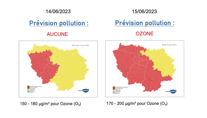 AIRPARIF prévoit un dépassement en Ile-de-France du seuil d'information et de recommandations pour les particules fines PM 10 demain jeudi 15 juin 2023 avec un niveau maximum compris entre 170 μg/m3 et 200 μg/m3.