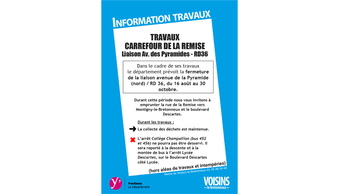 Pendant cette période nous vous invitons à emprunter la rue de la Remise vers Montigny-le-Bretonneux et le boulevard Descartes.