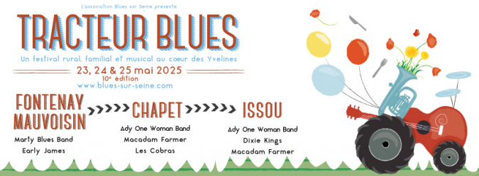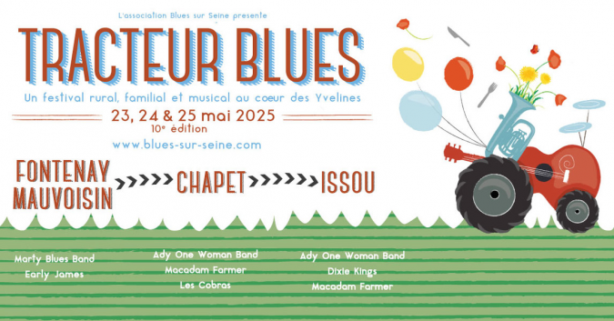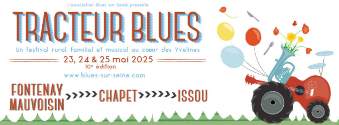 TRACTEUR BLUES, du 23 au 25 mai 2025, un festival rural, musical et familial au cœur des Yvelines. L’association BLUES SUR SEINE présente la 10ème édition de Tracteur Blues qui se déroulera cette année sur les 3 communes de Fontenay-Mauvoisin, Chapet et Issou !