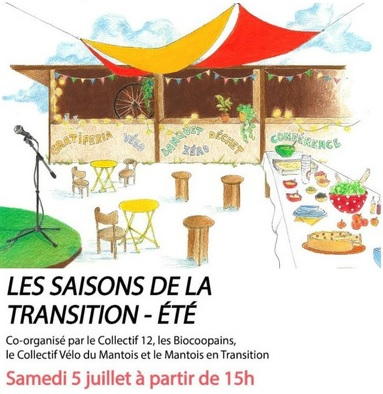 Les Saisons de la Transition - Session Été, le samedi 5 juillet à partir de 15h au COLLECTIF 12 à Mantes-la-Jolie. Un événement co-organisé par le Collectif 12, Les Biocoopains, le Collectif Vélo du Mantois et le Mantois en Transition. Entrée libre.