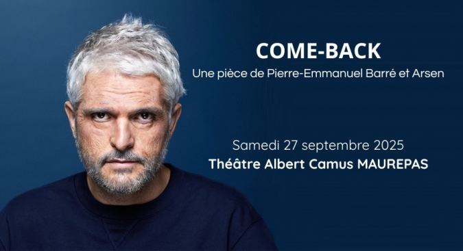 COME-BACK de Pierre-Emmanuel Barré et Arsen en représentation le samedi 27 septembre 2025 au Théâtre Albert Camus à MAUREPAS. Entre théâtre et stand-up, Pierre-Emmanuel Barré fait son grand retour sur scène dans son nouveau spectacle, COME-BACK, mis en scène par Arsen. Un « come-back » pas si heureux que cela à en croire les rumeurs qui circulent en 2031 : Pierre-Emmanuel Barré serait has-been, ringard.