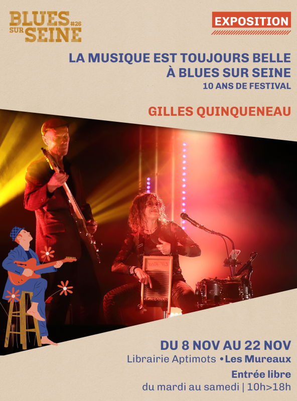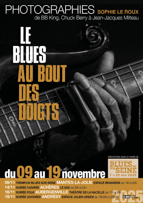 Celle de Gilles Quinqueneau installée pendant tout le festival à la librairie Aptimots aux Mureaux (Rétrospective de plus de 10 ans de festival), et Le Blues au bout des doigts de la photographe Sophie Le Roux, ou les mains les plus célèbres du blues, sera installée sur 4 sites de la programmation :