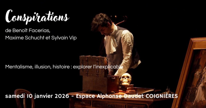 Conspirations, de Benoît Facerias, Maxime Schucht et Sylvain Vip, en représentation le samedi 10 janvier 2026 à l'Espace Alphonse Daudet à COIGNIÈRES. Un spectacle Atelier Théâtre Actuel en co-production avec La Cinquième Roue. Mystères, sorcellerie, complots... venez vivre un fascinant voyage dans le temps au coeur d’une incroyable affaire criminelle qui bouleversa le règne de Louis XIV.