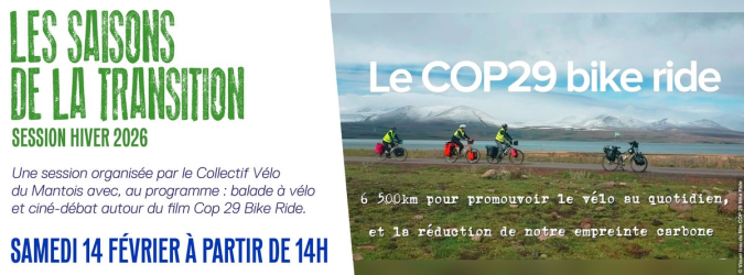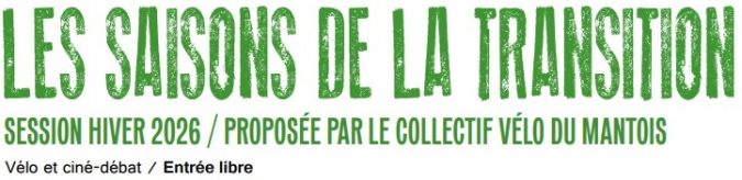 Les Saisons de la transition - Session Hiver 2026, le samedi 14 février à partir de 14h au Collectif 12 à Mantes-la-Jolie. Pour la deuxième année, le Collectif 12, en partenariat avec les Biocoopains, le Mantois en Transition et le Collectif Vélo du Mantois, vous propose 4 rendez-vous au fil des saisons construits sur un programme de projections de films, de rencontres-débats, d'ateliers, autour de l’environnement et des préoccupations écologiques.