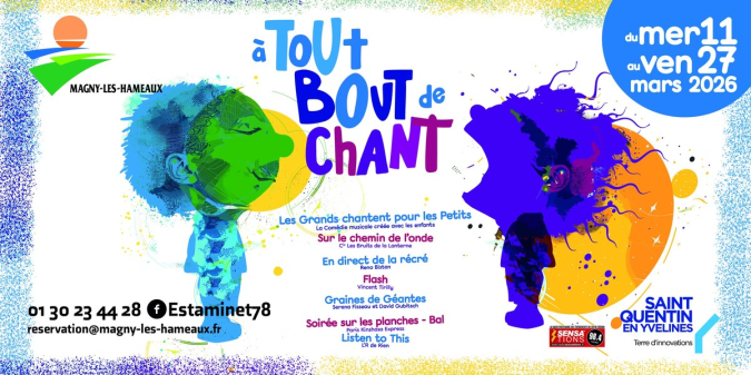Au programme : la troupe des Grands chantent pour les petits, la poésie musicale des Bruits de la Lanterne, le spectacle SQY Hip Hop Tour 2026 Listen to This, le concert pop En direct de la récré ! avec Reno Bistan, la comédie musicale Flash de Vincent Tirilly, le ciné-concert plein de douceur Graines de géantes de Serena Fisseau, et le bal de clôture festif avec le Paris Kinshasa Express !